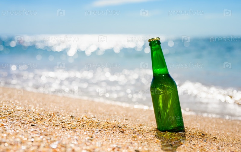 Бутылка пива на фоне отражений моря. Холодный напиток на пляже в сильную жару