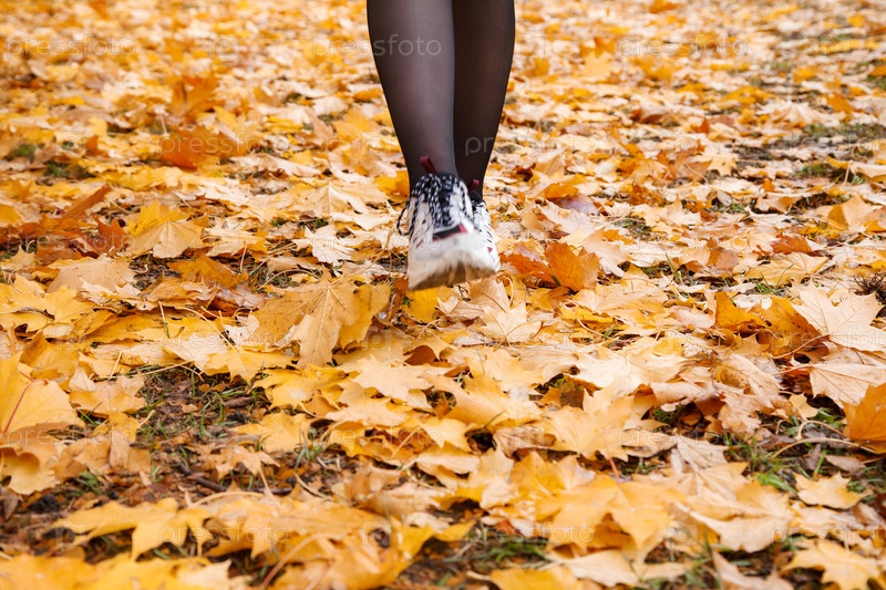 Девушка в кроссовках гуляет осенью в парке по желтым листьям