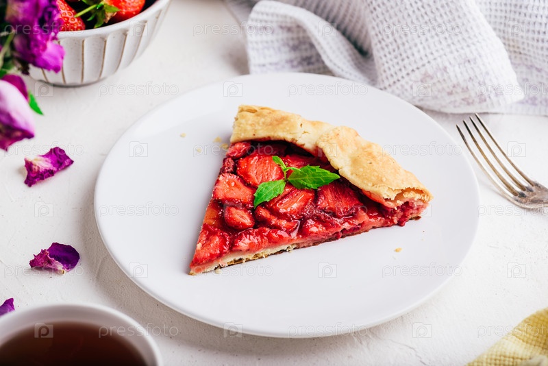 Кусочек вегетарианской свежей запеченной клубники с листьями мяты на белой тарелке