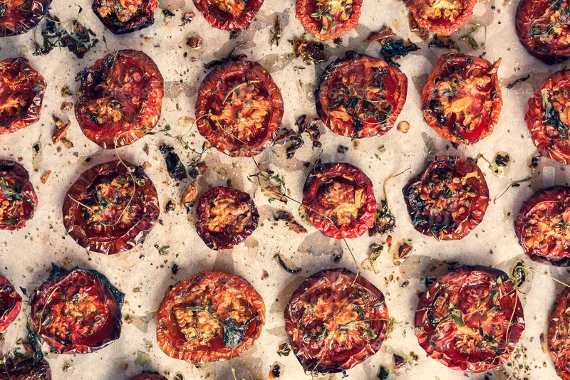 Подготовленные вяленые помидоры с оливковым маслом и специями на пергаментной бумаге. Вид сверху