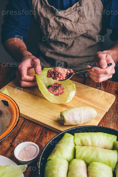 Шеф-повар готовит белую капусту, фаршированную мясным фаршем, на кухне