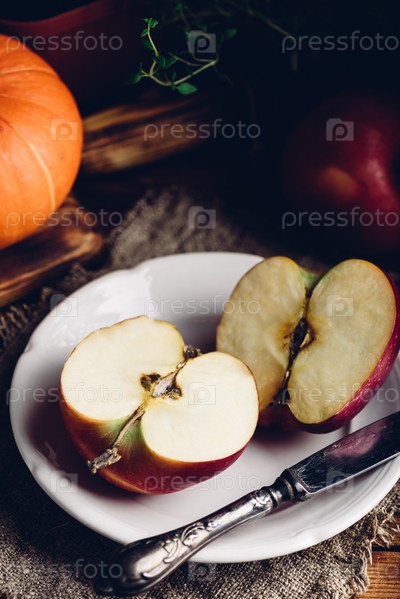 Две половинки красного яблока на белой тарелке со старинным ножом в деревенской обстановке