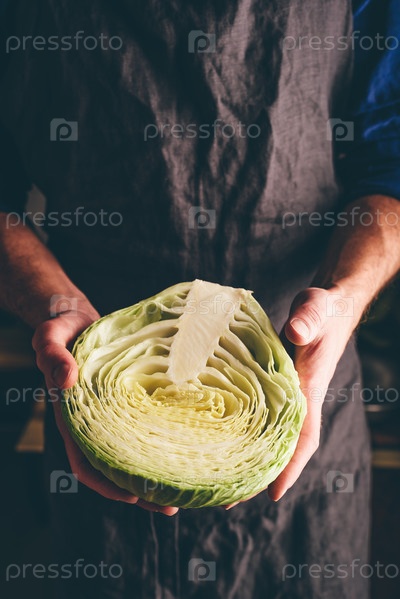 Мужчина держит в руках половину белокочанной капусты
