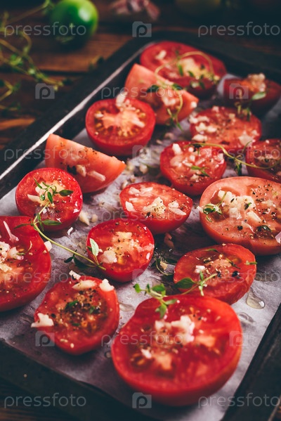 Приготовление вяленых помидоров с тимьяном и чесноком на противне