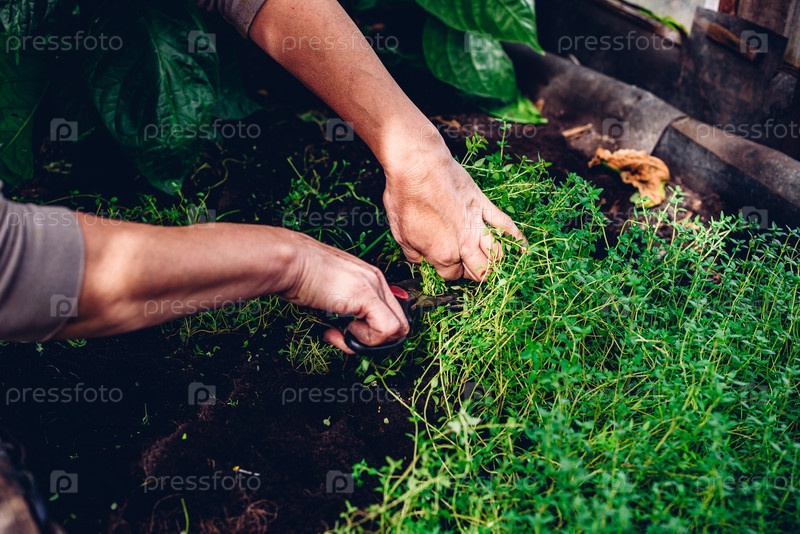Женщина срезает тимьян с кровати в теплице