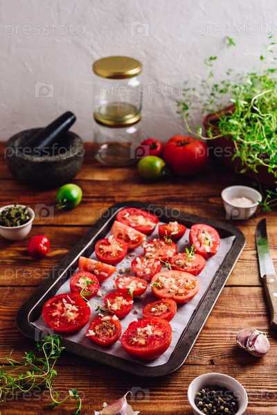 Разрезанные пополам помидоры с тимьяном и чесноком на противне готовы к приготовлению