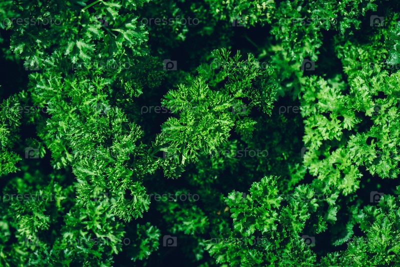 Свежая кудрявая петрушка с каплями воды на листьях в огороде. Вид сверху