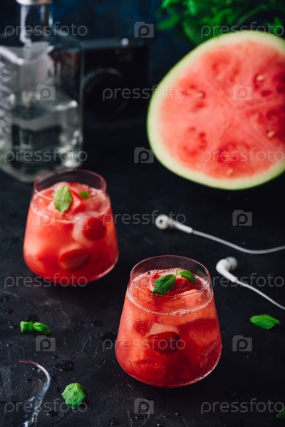 Стаканы арбузно-клубничного коктейля с мятным гарниром на темном бетонном фоне