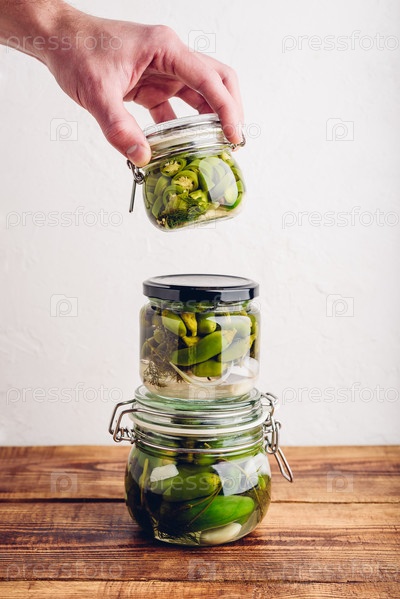Мужская рука держит одну из трех стеклянных банок свежемаринованного перца халапеньо с травами и чесноком. Копировать пространство