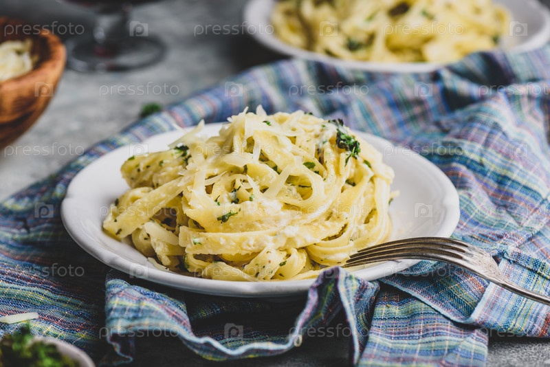 Домашняя паста феттучини с соусом Альфредо на тарелке