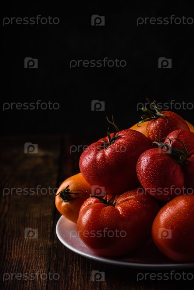 Свежие красные и желтые помидоры на тарелке