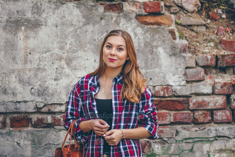Красивая девушка стоит у кирпичной стены