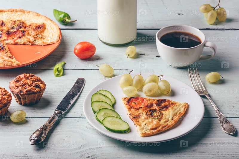 Фриттата с чашкой кофе, виноградом и булочками