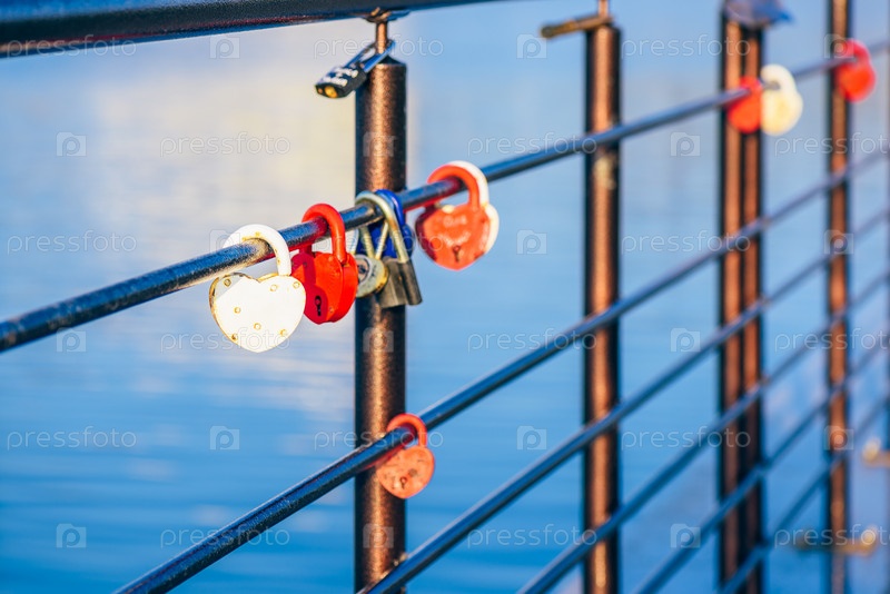 Металлические замки висят на перилах