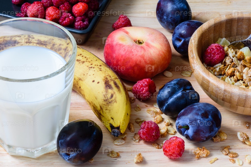 Супер завтрак с мюсли, ягодами, фруктами и молоком