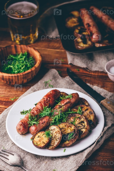 Свиные колбаски, запеченные с ломтиками баклажанов на белой тарелке, украшенные свежим укропом