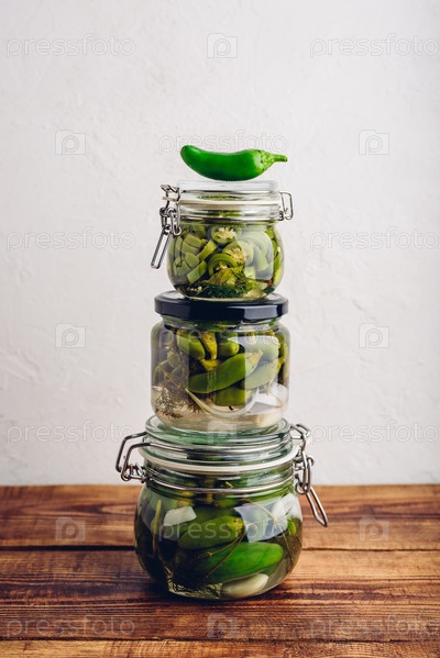 Три стеклянные банки свежеконсервированного перца халапеньо с травами и чесноком на деревянном столе. Копировать пространство