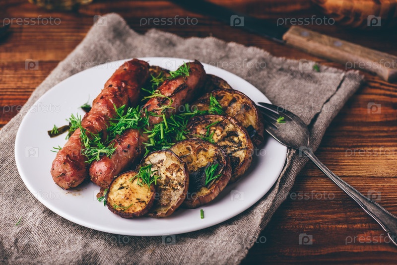 Свиные колбаски, запеченные с баклажанами и зеленью на белой тарелке с укропом