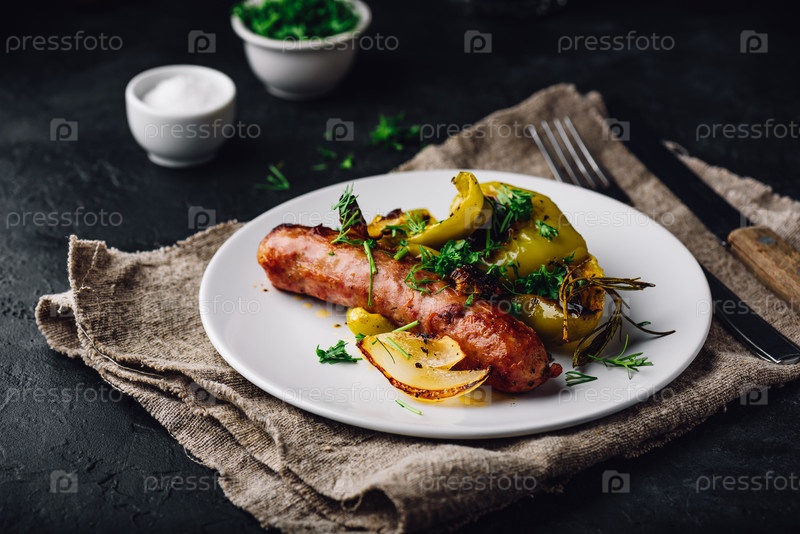 Свиная колбаса, запеченная с зеленым перцем, луком и зеленью