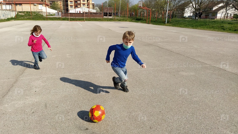 Девочка и мальчик играют в футбол на асфальтированной спортивной площадке. Дети носят защитные хирургические маски для предотвращения болезней, передающихся воздушно-капельным путем. Семейный спорт во время вирусной пандемии. Дети ходят в джинсах. Солнечн