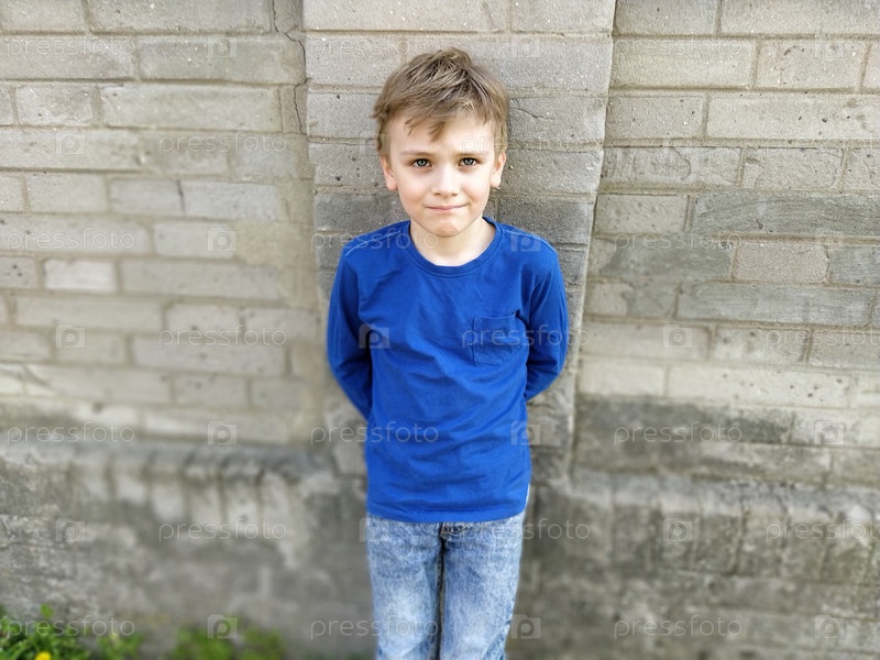Красивый белый мальчик в синем свитере или длинном рукаве поджал губы. Ребенок на фоне кирпичной стены в размытой форме. Портретная съемка. На лице эмоция смущения, вины