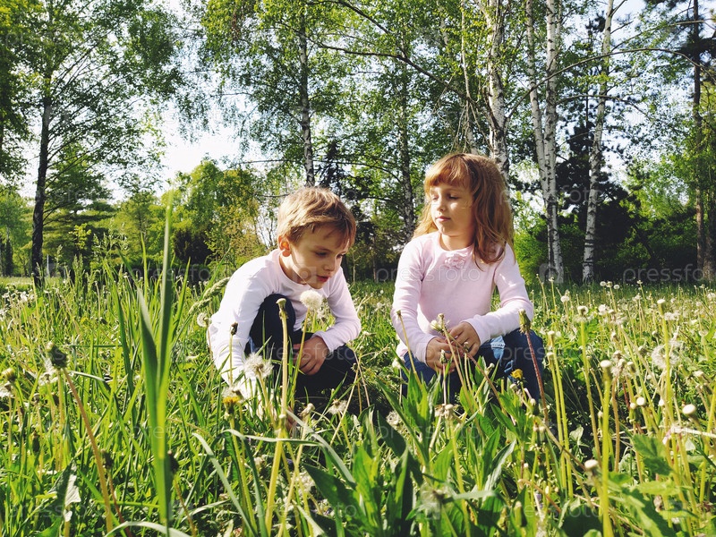 Мальчик и девочка на траве. Милые дети собирают луговые цветы и дуют на семена одуванчика. Дети повернулись друг к другу