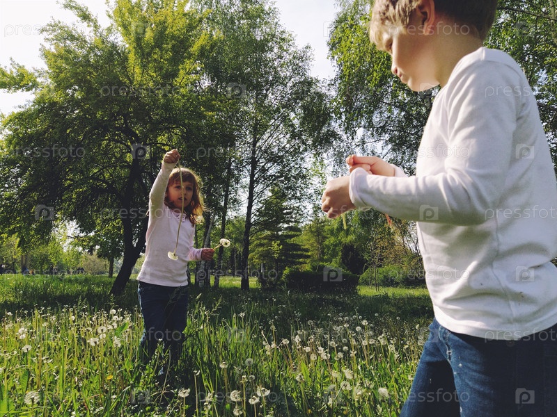 Мальчик и девочка на траве. Милые дети собирают луговые цветы и дуют на семена одуванчика