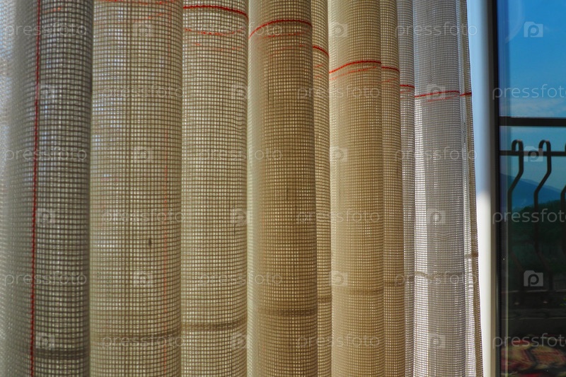 Белые грубые хлопчатобумажные или льняные шторы из переплетений тонких нитей. Простой компактный экономичный интерьер квартиры. Оформление окна в комнате. Красная полоса