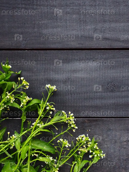 Цветы пастушеского кошелька на деревянном фоне. Копируйте место для текста. Карта для праздника. Деревянный фон. Белая пастырская сумка Capsella bursa-pastoris, растение семейства горчичных Brassicaceae