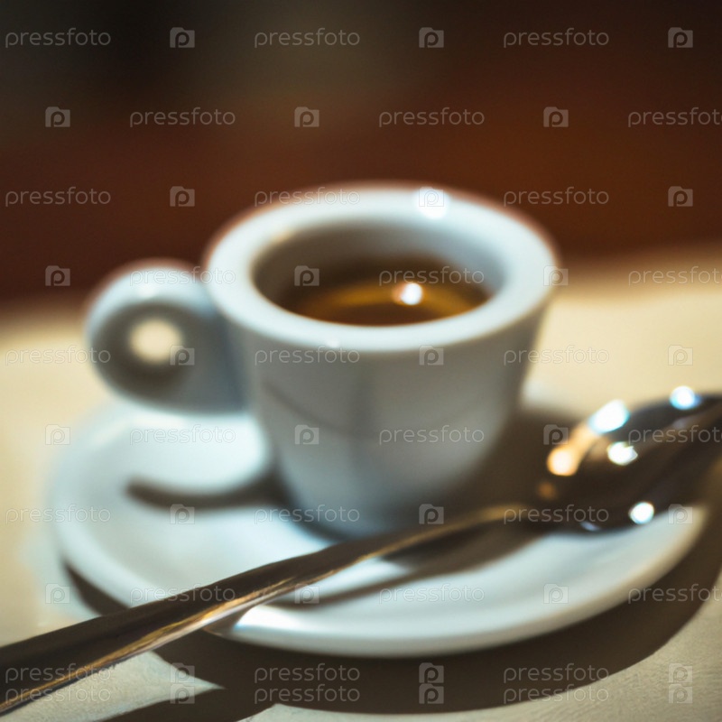 Чашка кофе в кафе. Эффект анаморфотного боке. Тилт-шифт фото. Горячий кофе в белой чашке с поддонником и ложкой. Кофе остывает. Аромат кофейных зерен. Этикетка или реклама. Мыло