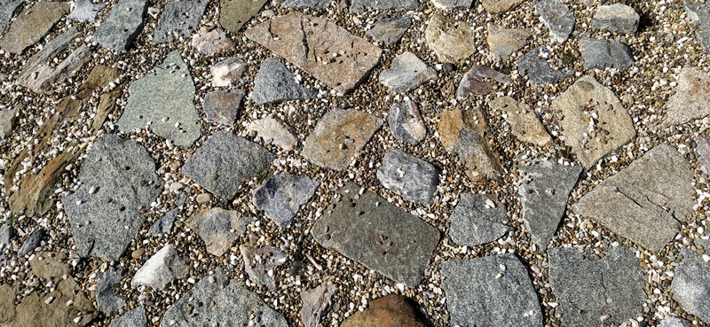 Тротуар вымощен неровными натуральными серыми и коричневыми камнями. Между щебнем булыжника есть мелкая галька, земля, песок, трава. Солнечное освещение. Площадь в старом европейском городе