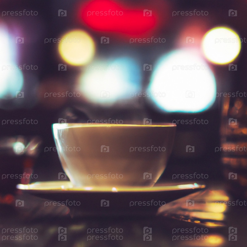 Чашка горячего чая в кафе. Эффект анаморфотного боке. Тилт-шифт фото. Вкусный ароматный чай в милой чашке с блюдцем. Чай остывает. Натуральный аромат. Этикетка или реклама. Испарение