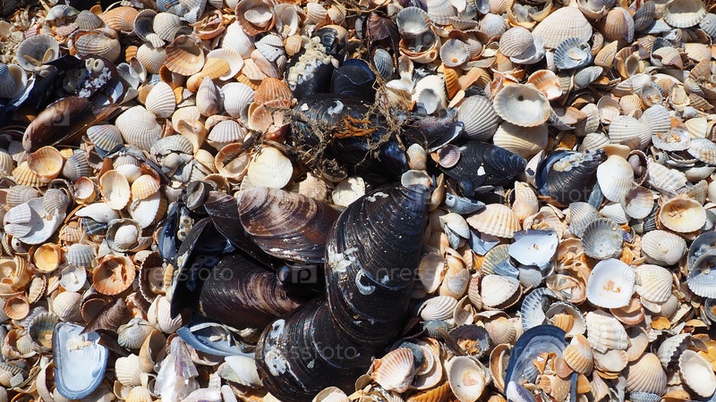 Раковины брюхоногих двустворчатых моллюсков. Азовское и Черное моря, Голубицкая. Ракушки на берегу. Cerastoderma lamarcki, Hypanis colorata, Anadara inaequivalvis, Mytilus galloprovincialis