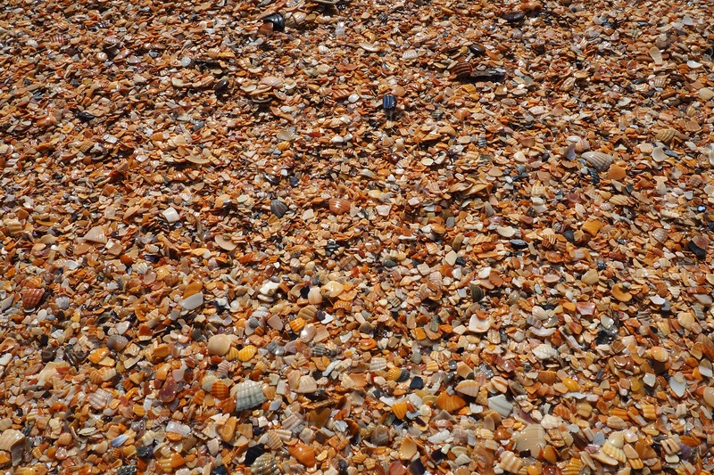 Раковины брюхоногих двустворчатых моллюсков, обитающих в Азовском и Черном морях. Бежевые, коричневые, черные, белые ракушки на берегу. Деревня Голубицкая. Сломанные маленькие ракушки