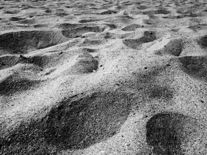 Песок при слабом солнечном свете. Пустой пляж, следы и вмятины на песке. Дюны Черного моря. Рыхлая осадочная порода. зерна горного кварца и минерала кремнезема. Бело-черный монохромный