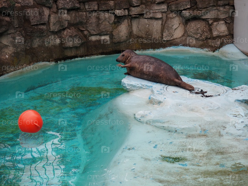 Обычный тюлень Phoca vitulina находится возле бассейна и хочет поиграть с красным мячом