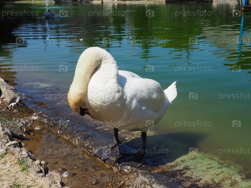 Белый лебедь на берегу водохранилища. Птица у воды чистит перья. Станишичи, Биелина, Босния и Герцеговина, зоопарк в этнодеревне. Фауна Европы