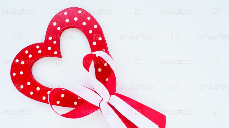 Концепция дня святого Валентина. Красное деревянное сердце с белыми точками и ленточным бантом на палочке. Белый фон. Красивый бант в качестве украшения. Любовь и отношения. Признание или поздравление