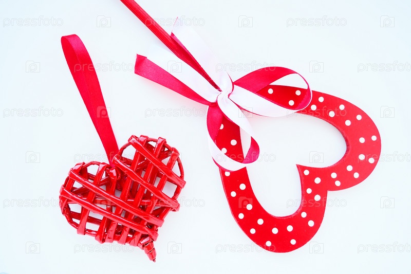 Концепция дня святого Валентина. Два красных сердца. Деревянное сердце с белыми точками и ленточным бантом на палочке. Плетеное сердце с петлей. Белый фон. Плоская укладка