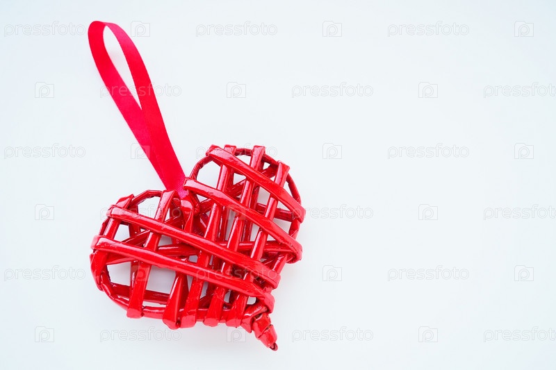 Красное плетеное сердце с шелковой лентой на белом фоне. День святого Валентина. копирайт. Приятный сувенир - кулон под углом