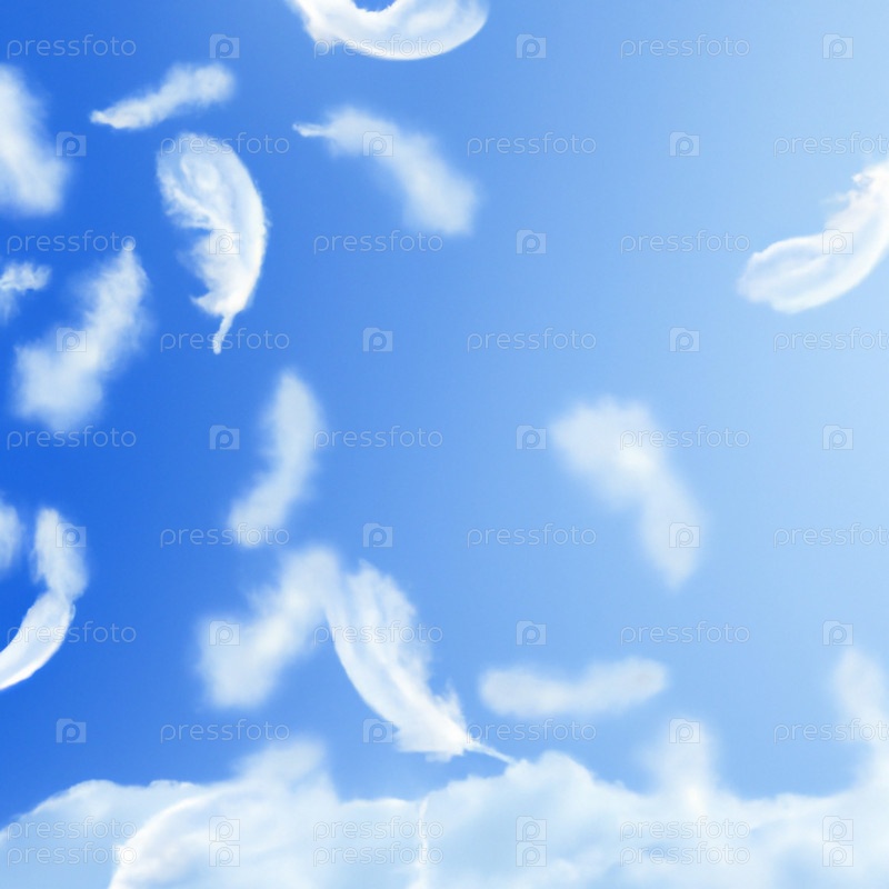 Пушистые белые перья падают в голубое небо. Концепция плавающей свободы пера. Летающие перья и легкие белые облака на фоне голубого неба. Мягкий воздушный лебяжий пух. Облака и солнце