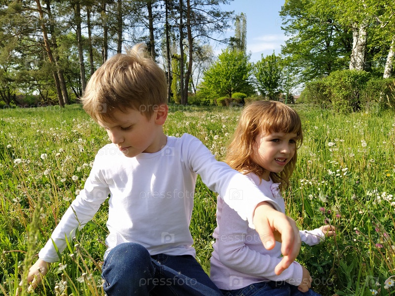 Мальчик и девочка на траве. Милые дети собирают луговые цветы и дуют на семена одуванчика. Дети сидят на траве спиной друг к другу и смотрят в разные стороны. Гримасы на лицах. Белые блузки и синие джинсы
