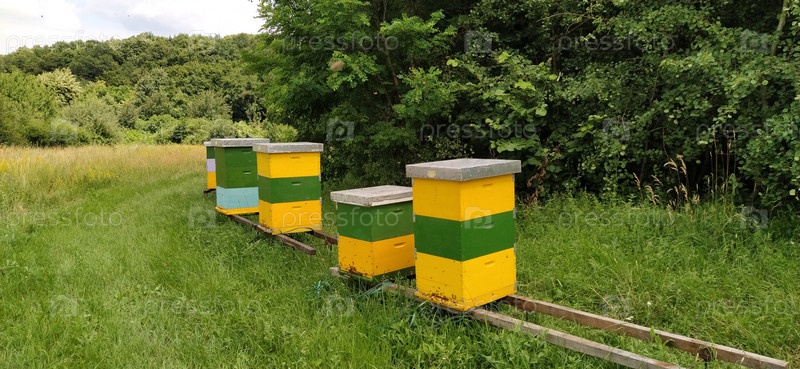 Ульи с пчелами. Пчеловодство. Ульи стоят в природе и окрашены в желтый, зеленый и синий цвета. Растения – медоносы. Пасека в Сербии. Пчелы собирают цветочный нектар и превращают его в мед