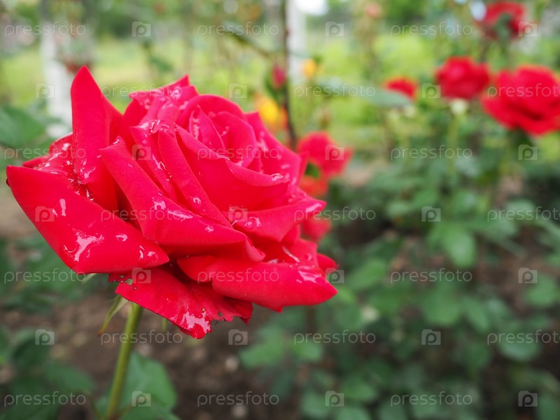 Цветущая романтическая свежая румяная роза. В саду цветут розовые и малиновые розы. Лепестки с каплями воды