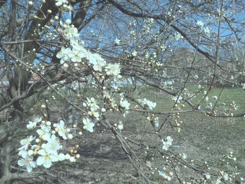 Дерево, цветущее белыми цветами. Вишня, яблоня, слива или черешня в цветущем состоянии. Нежные белые лепестки. Открытка. Поздравляю с днем весны, с днем матери. Мягкий фокус