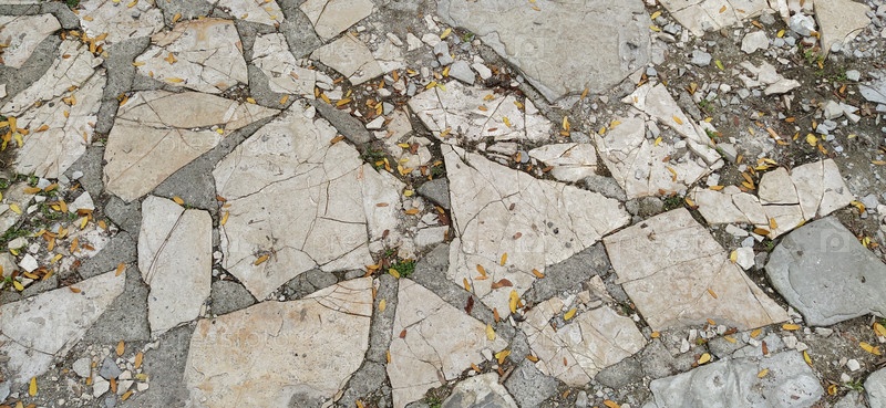 Тротуар вымощен неровными натуральными серыми и коричневыми камнями. Между щебнем булыжника есть мелкая галька, земля, песок, трава. Солнечное освещение. Площадь в старом европейском городе
