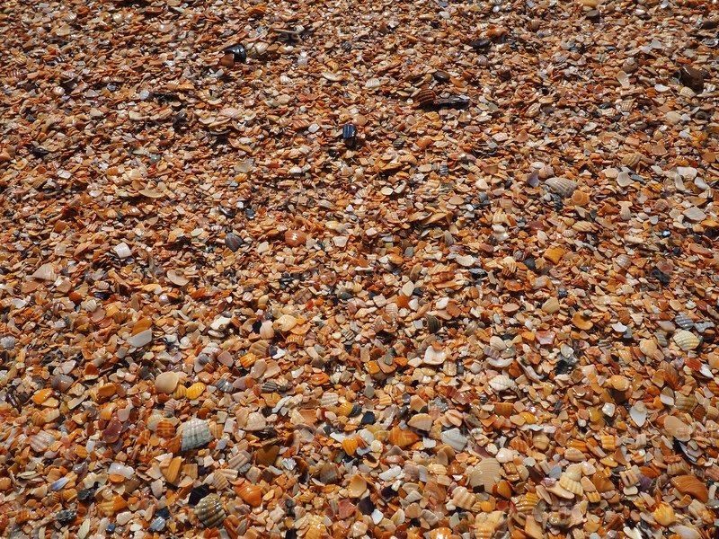 Раковины брюхоногих двустворчатых моллюсков, обитающих в Азовском и Черном морях. Бежевые, коричневые, черные, белые ракушки на берегу. Деревня Голубицкая. Сломанные маленькие ракушки