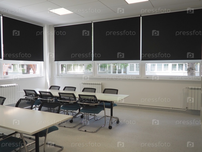 Стол и стулья в переговорной в офисе, в классе или в зале библиотеки. Белая, черная и серая краска в интерьере. Черные жалюзи для затемнения комнаты. Современный дизайн интерьера