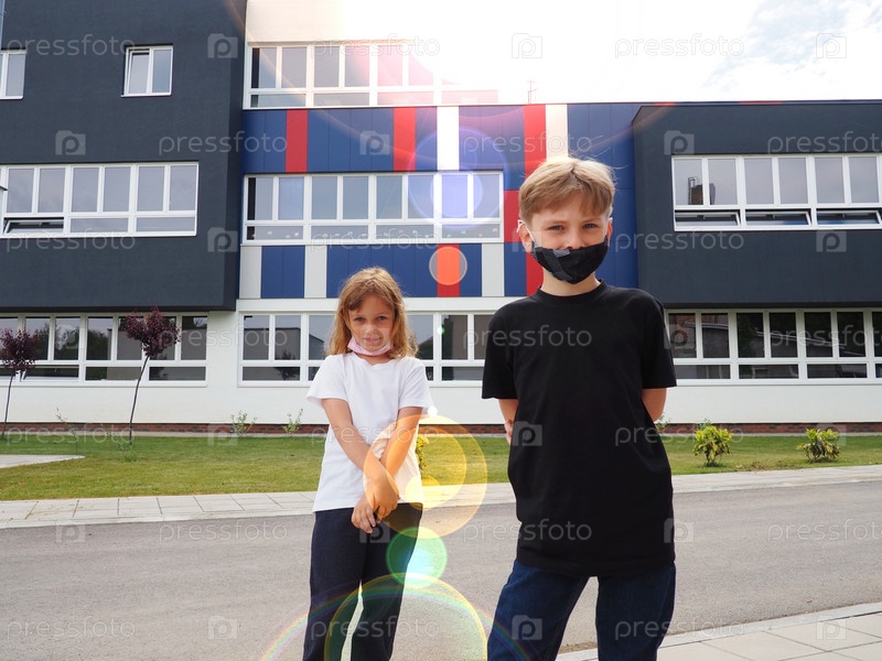 Белокурый мальчик 8 лет и белокурая девочка 7 лет стоят на фоне современной школы и смотрят в камеру. Дети носят защитные маски. Солнечные блики