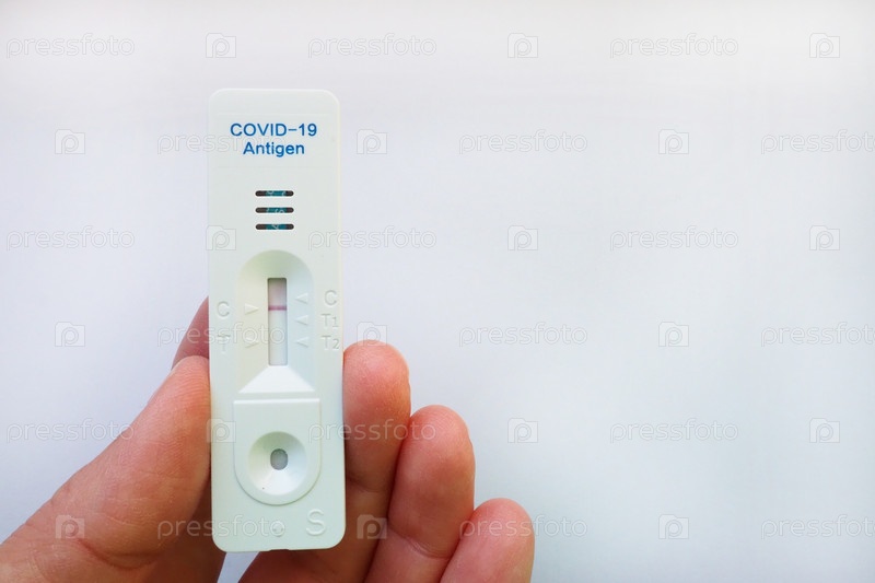 Результат теста на COVID-19 отрицательный, заражения нет, с использованием оборудования для экспресс-тестирования. Тест на коронавирус в руке, белый фон. Скопируйте пространство. Тестирование концепции коронавирусной инфекции